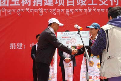 省委常委、省政府常務副省長、玉樹災后重建現場指揮部指揮長徐福順,國務院國資委綜合局局長劉南昌、省政府副秘書長毛占彪、玉樹州政府副州長布尕、中國建筑材料集團有限公司(以下簡稱中國建材集團)總經理姚燕、副總經理劉寶瑛,以及省國資委、發改委、建設廳、民政廳有關領導出席了當天在結古鎮舉行的捐贈儀式。青海水電集團總經理王海青代表受捐方接受了捐贈支票。劉南昌局長、姚燕總經理、布尕副州長分別在儀式上講話。姚燕在講話中表示,中國建材集團還將一如既往地支持災區發展建設,努力發揮產業與科技優勢,用新的理念、新的技術、新的生產方式,為玉樹地震災區災后重建做出更大的貢獻。